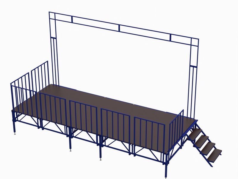 Подиум дополнен верхней арочной рамой из труб 40×25×2мм и 25×25×2мм, на которую можно закрепить освещение или декор. Основа — каркас из труб 50×50×3мм и 50×25×2мм. Пол — ламинированная фанера 21мм. Устойчивость и антикоррозийная защита обеспечены порошковой покраской с грунтом.